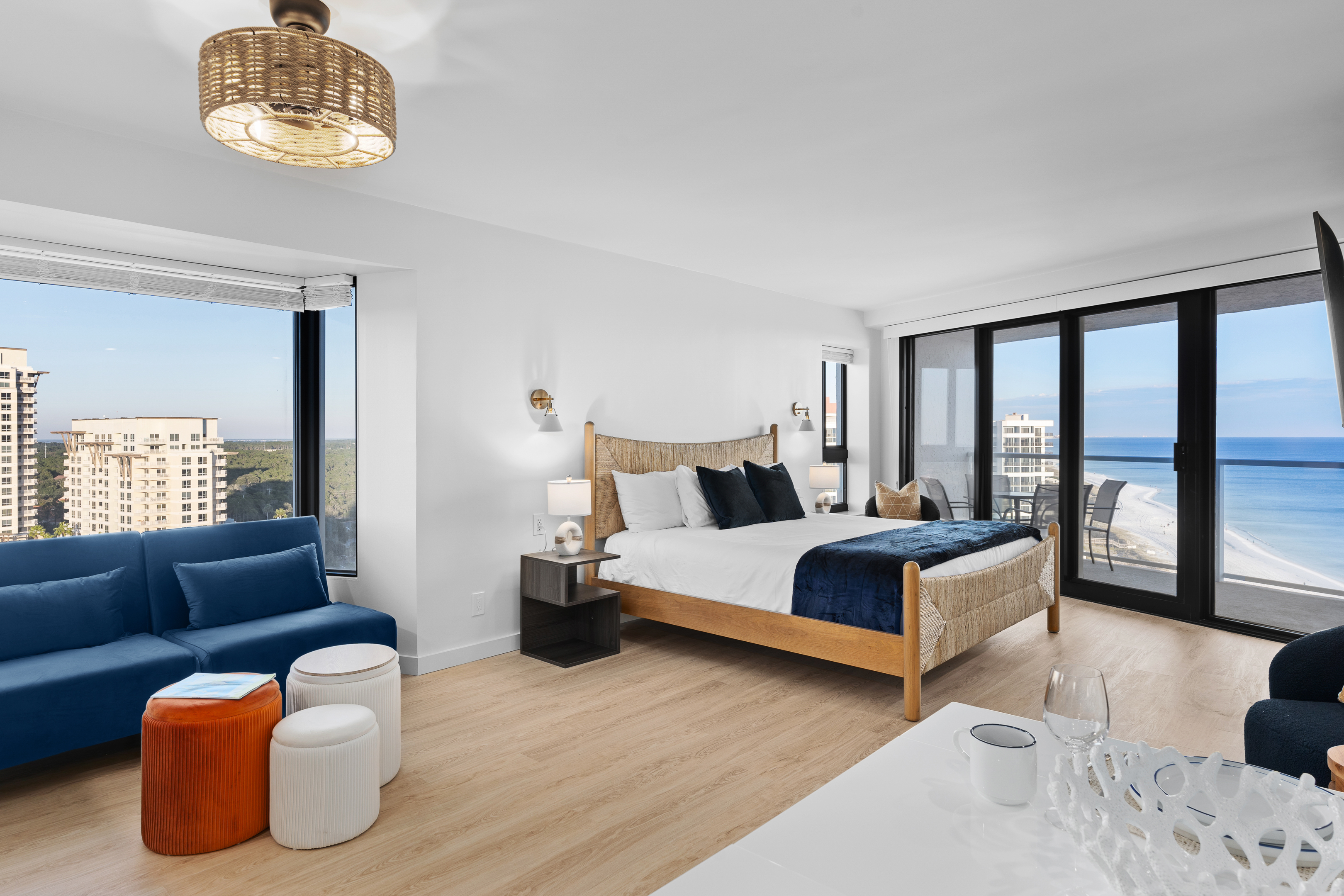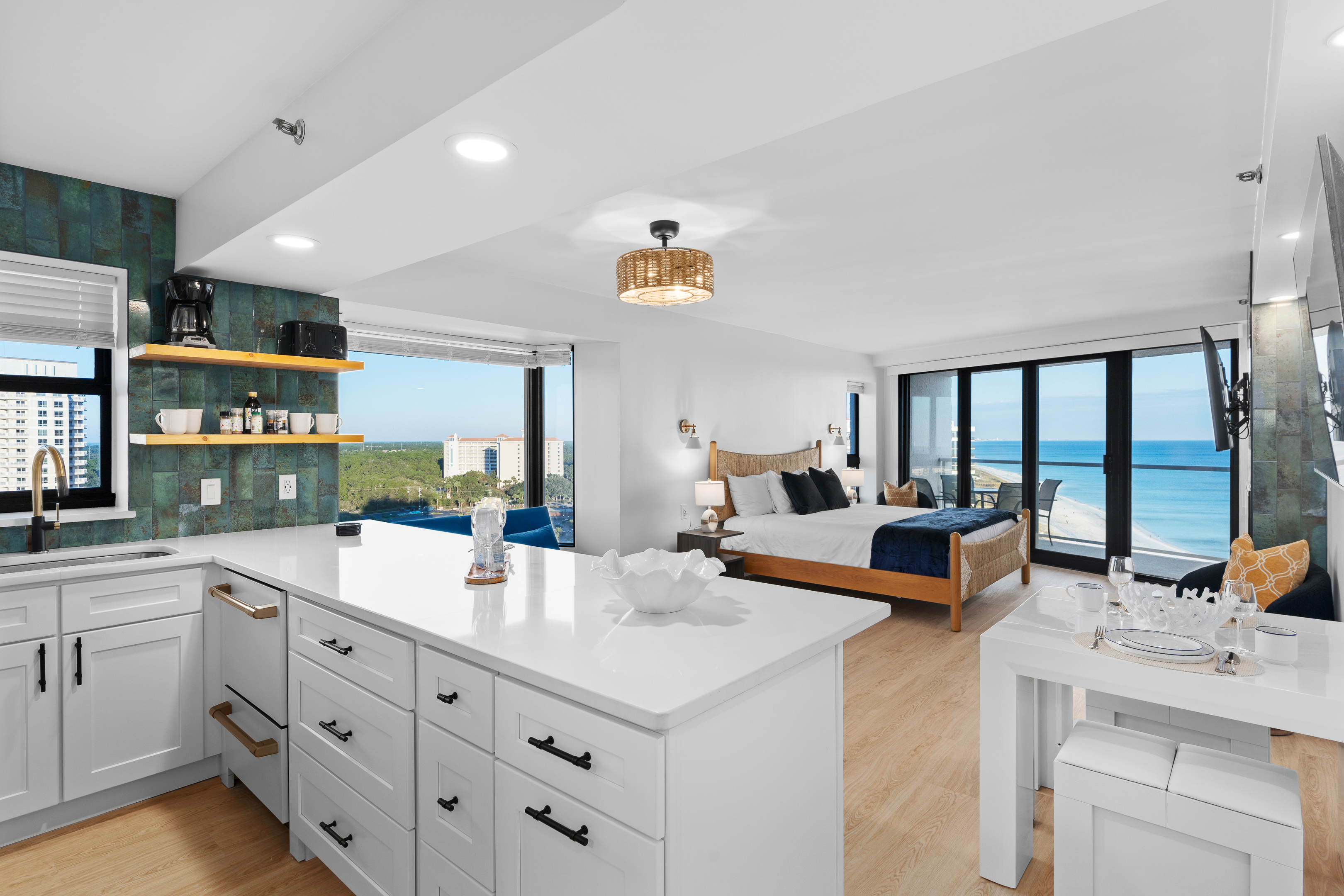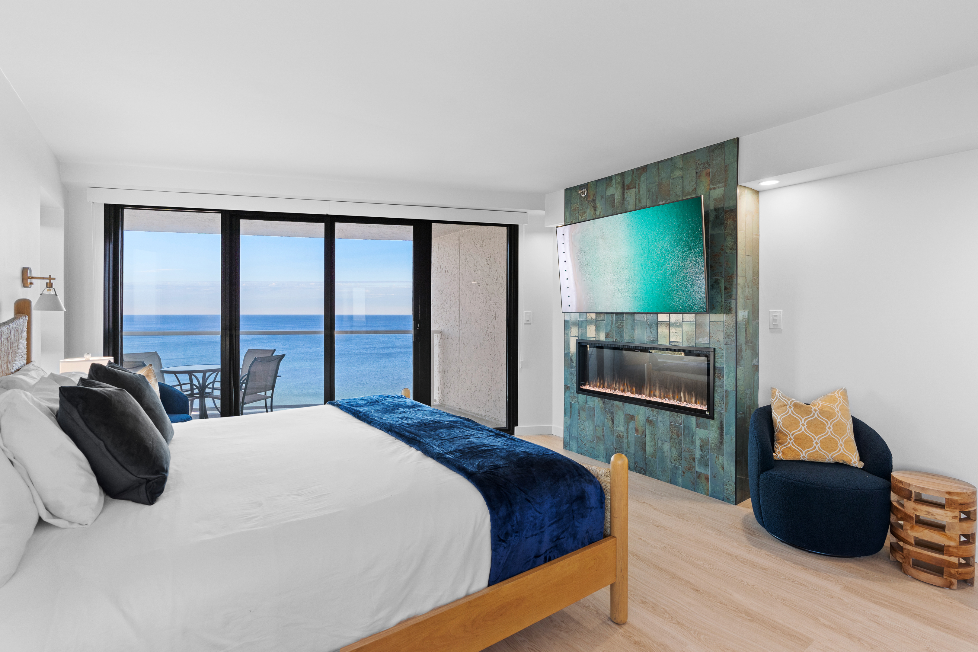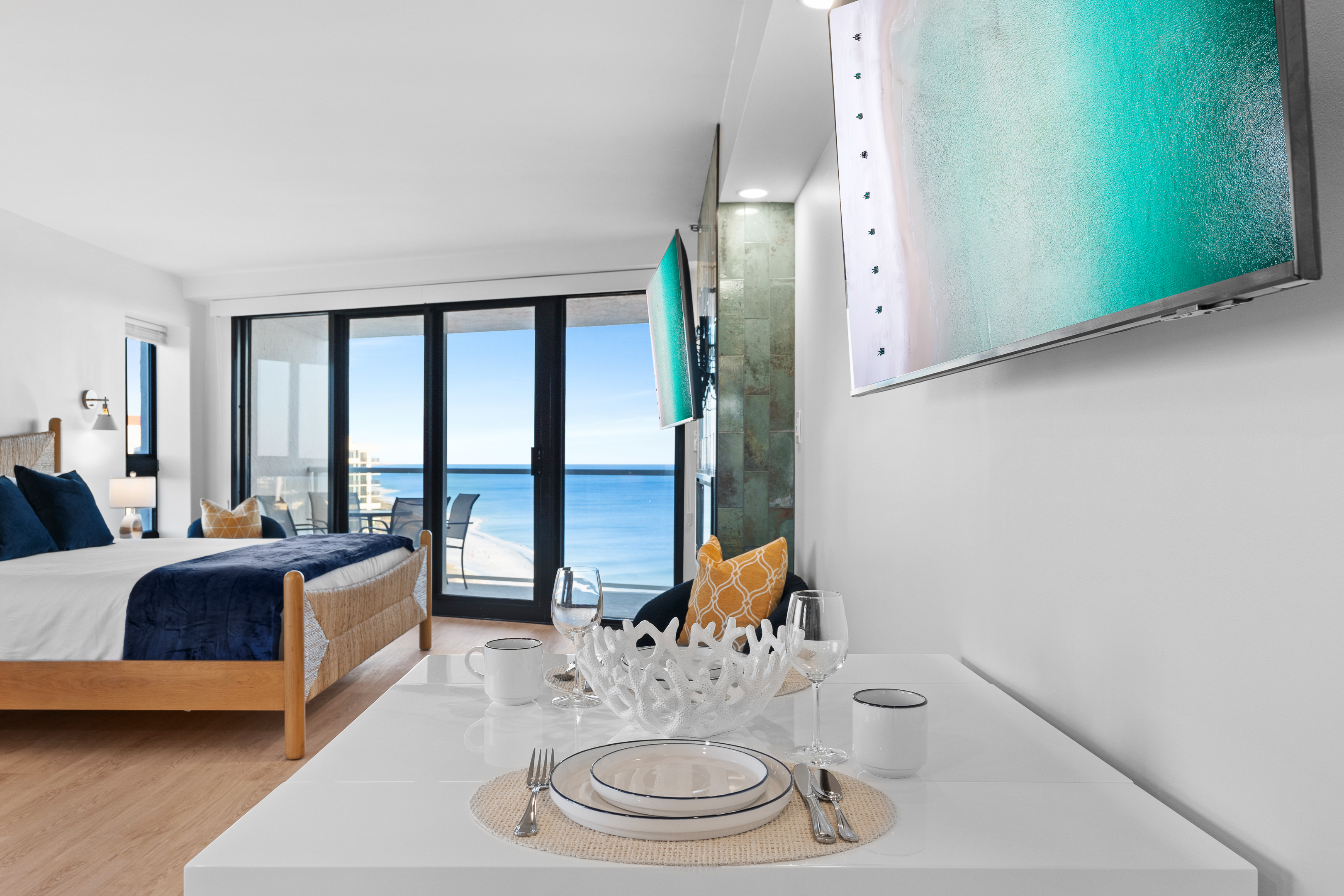 Signature chic + modern oceanfront retreat perched on the top floor with breathtaking Gulf views. This stylish studio features a sleek fireplace, private balcony, and luxe open design. Enjoy fast WiFi, unwind in the hot tub, or relax by the resort pool. Your coveted beach is just steps away. Perfect for a romantic getaway or solo escape, this coastal sanctuary blends comfort, elegance, and unforgettable scenery for the ultimate beachfront experience.