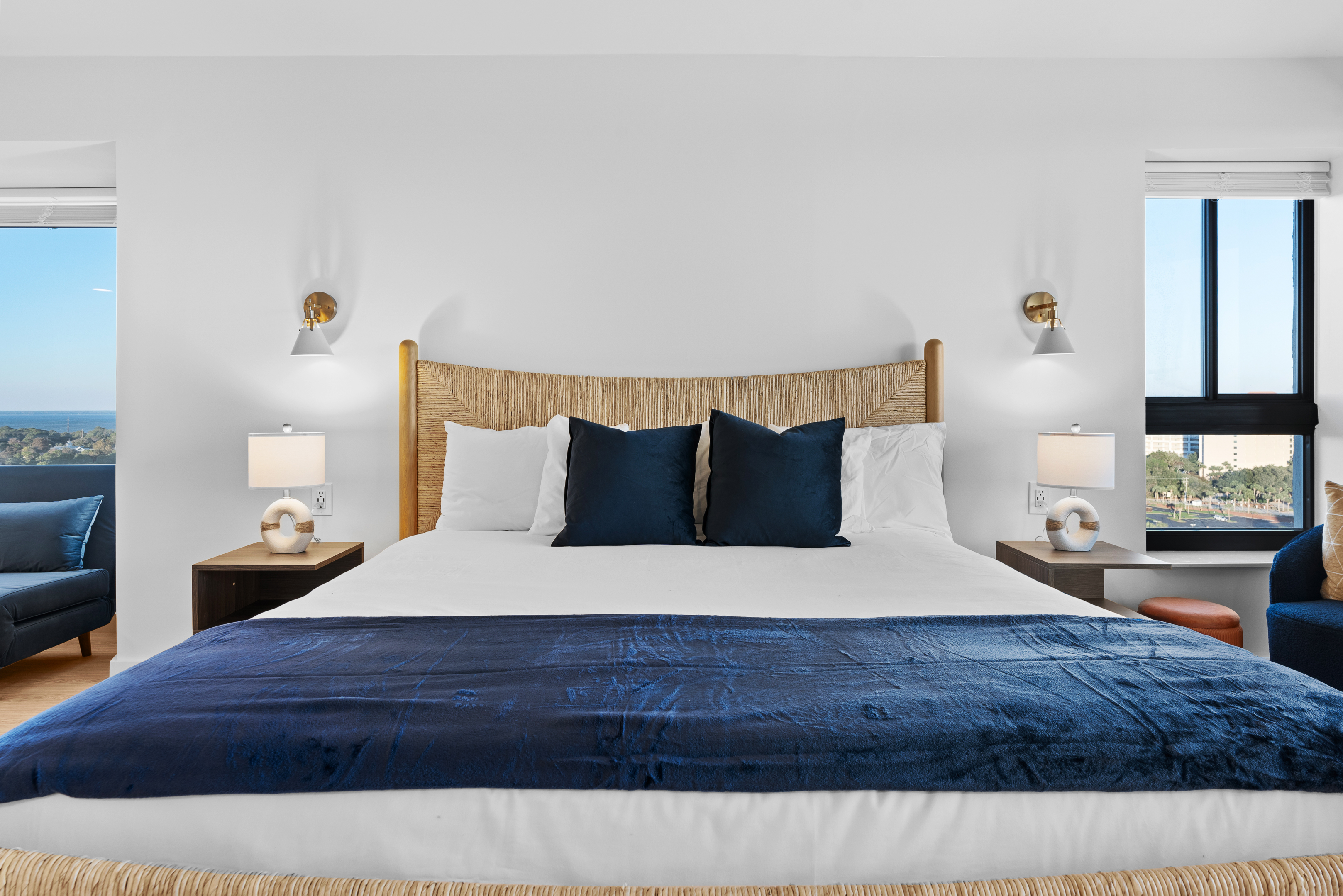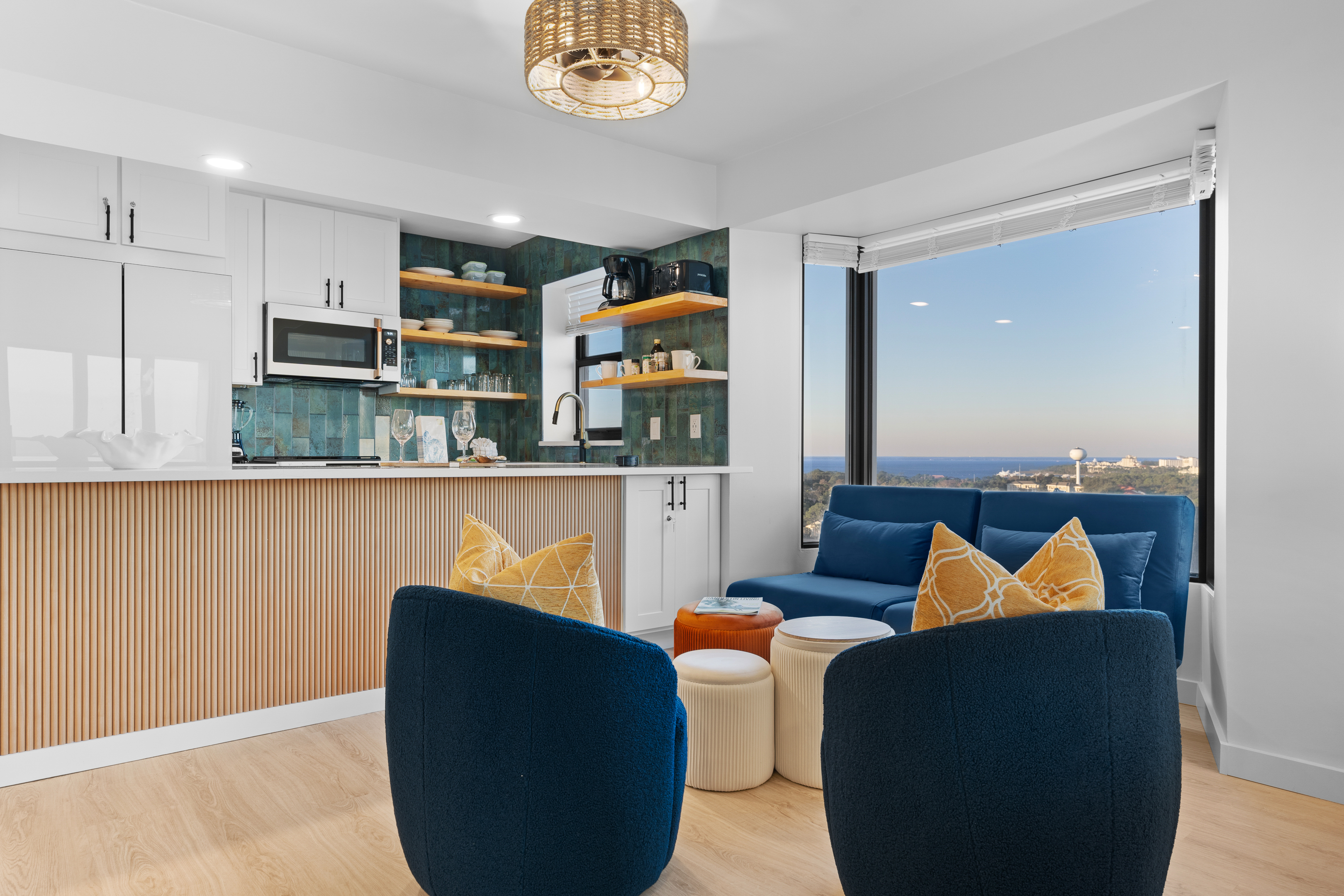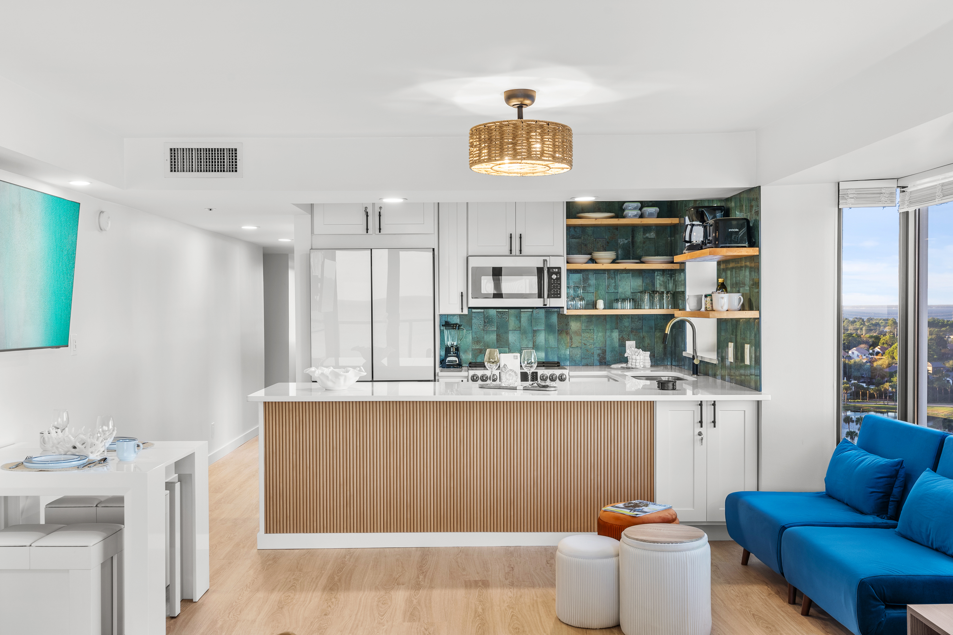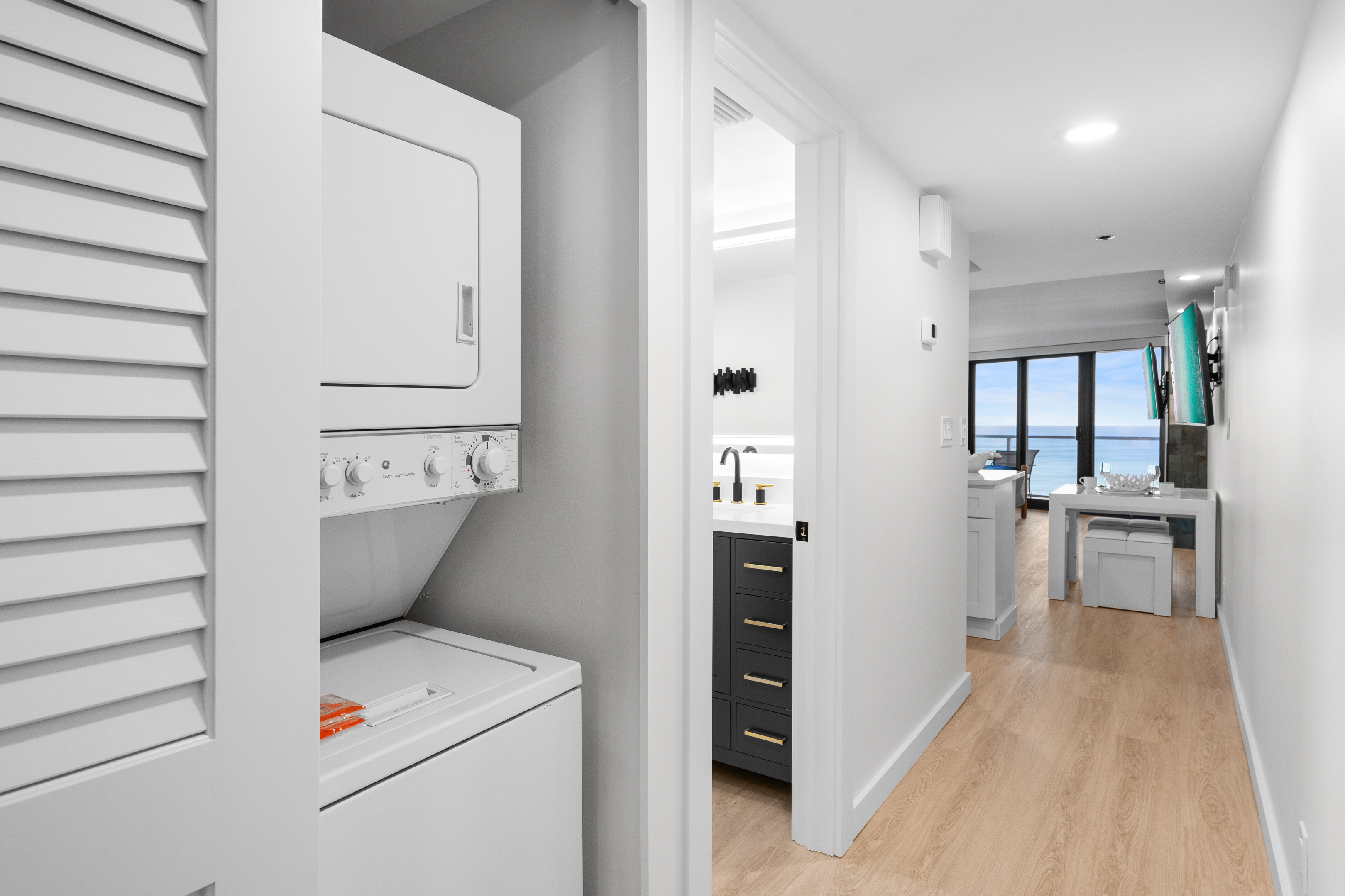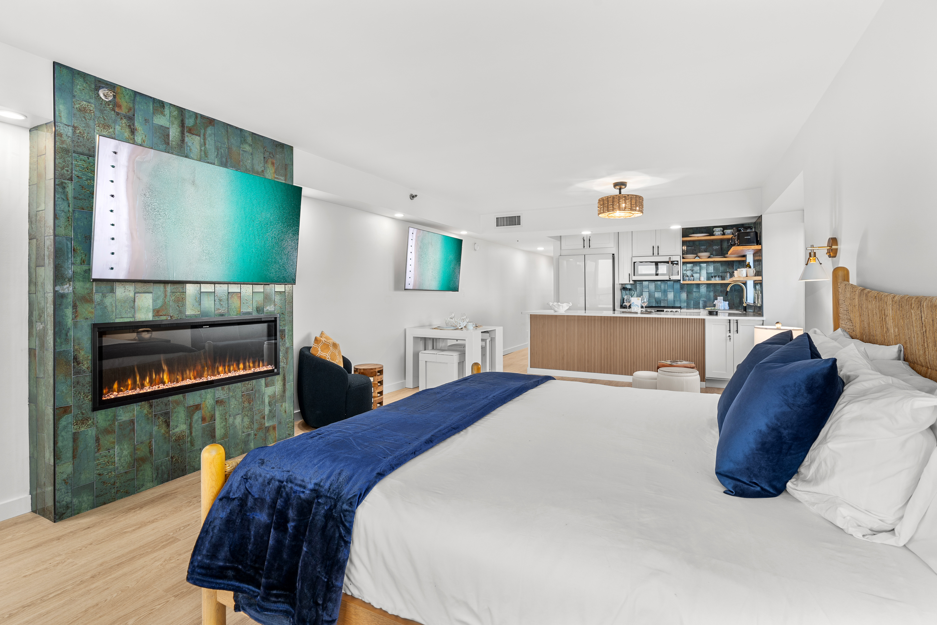 Sleeping Arrangements - Sleeps 2 Studio Bedroom Area: - King bed with soft linens and cozy pillows - Smart TV Netflix - Disney+ and more streaming options; cable + cozy fireplace LIVING ROOM: - Mid-century modern chic navy couch with pillows + two modern barrel chairs - Smart TV with Netflix, Disney+ and more KITCHEN: - Fully equipped kitchen with modern appliances, including microwave, electric stove and oven, refrigerator, freezer, garbage disposal, and dishwasher - Cooking basics like pots, pans, baking sheets, and more (bring your own spices if needed) - Drip coffee maker, toaster, blender, wine glasses, coffee mugs, and more DINING: - Dining table with seating for 2 around a white modern table BATHROOM: - One full bathroom with toilet, designer walk-in shower, and single vanity sink with mirror - Essentials provided such as towels, hand soap, washcloths, and hair dryer OUTDOOR AREAS: - Private beachfront balcony with unobstructed beach/ocean views. - Ride the elevator down to the resort outdoor pool + hot tub to enjoy a swim immediately after check-in EXTRAS: Beach towels Free washer and dryer in-unit Laptop friendly work environment with WiFi for remote work PARKING: Book your stay with KirbyAppeal Vacations today and make this trip one to remember!