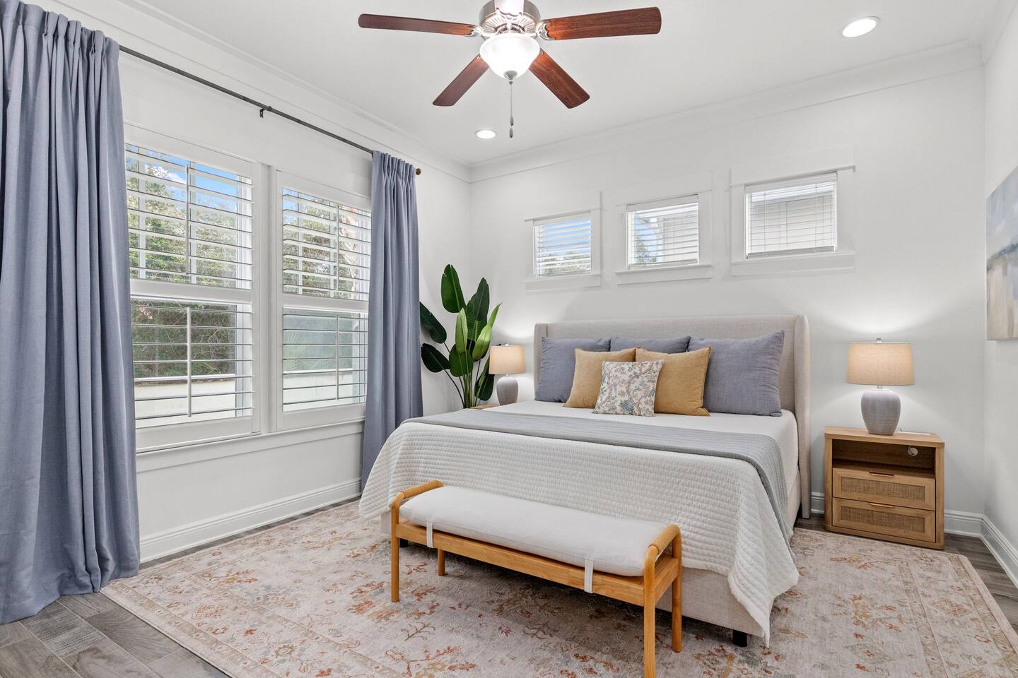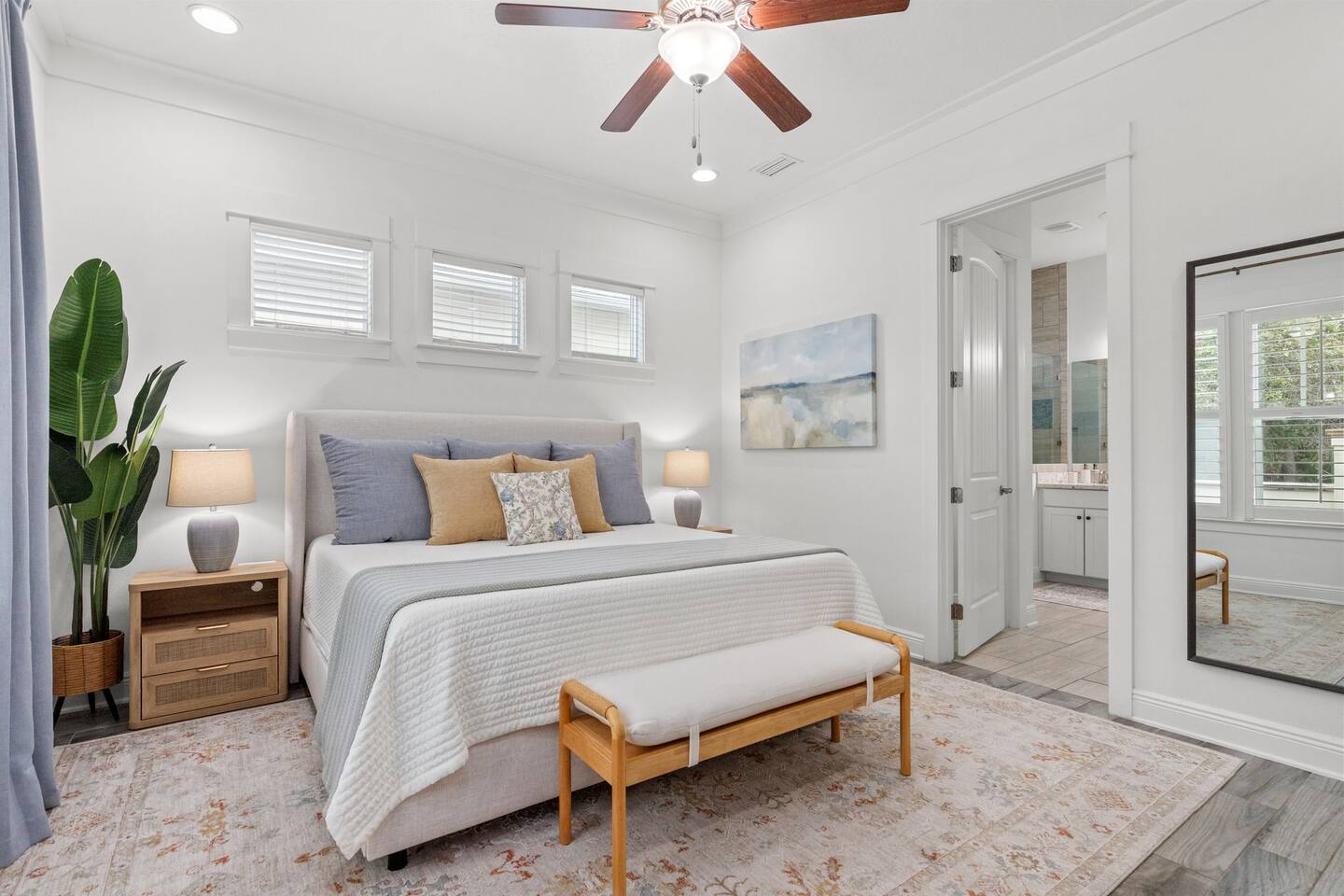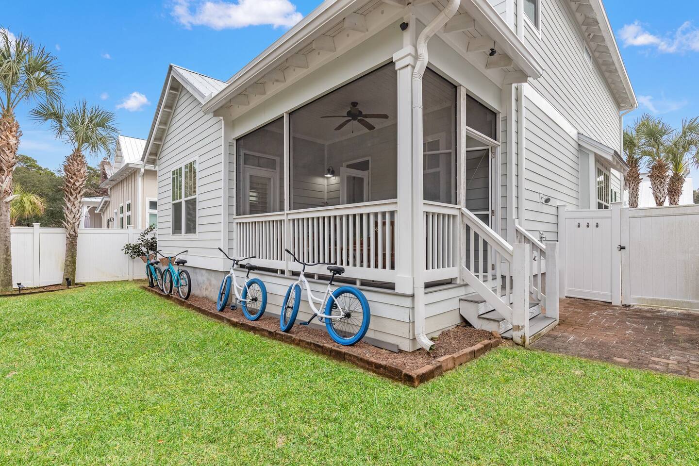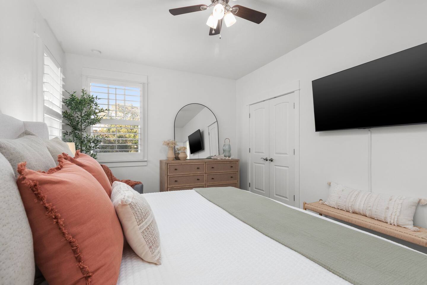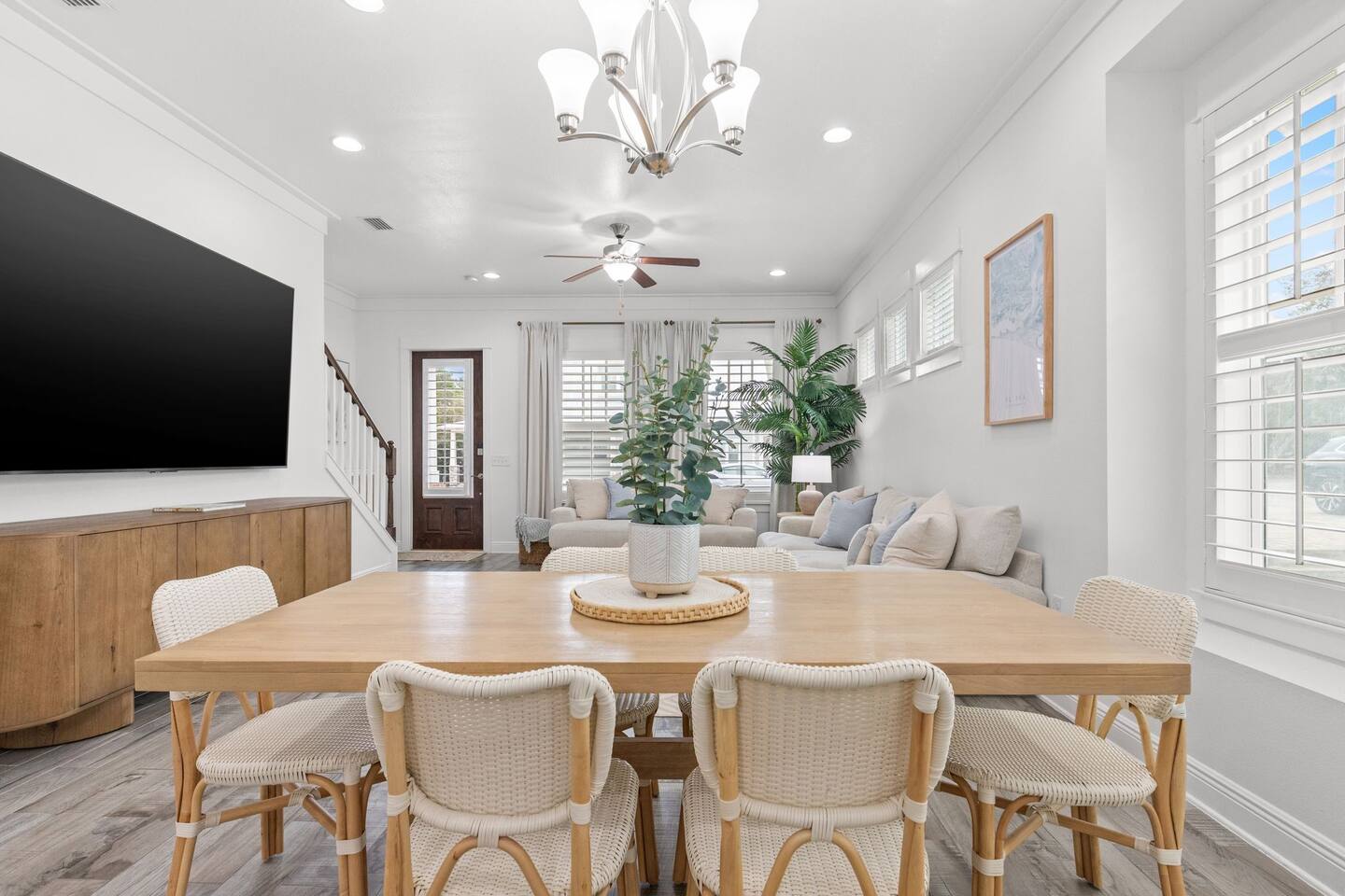 Enjoy rare privacy in Grande Pointe with no rear neighbors, a walled backyard, and a screened-in patio. Inside, relax with a massive 100” living room TV plus TVs in every bedroom. Ride the included bikes to Inlet Beach (3 min) or Rosemary Beach (10 min). Sleeps the whole crew with 2 Kings, a full-over-full bunk with trundle, and a queen sleeper. Guests enjoy free access to the neighborhood pool and Lake Powell dock—fun rain or shine.