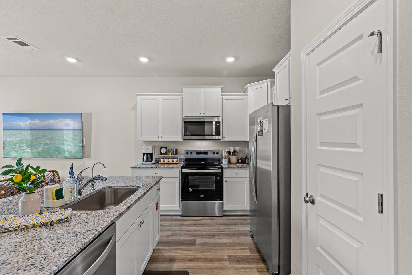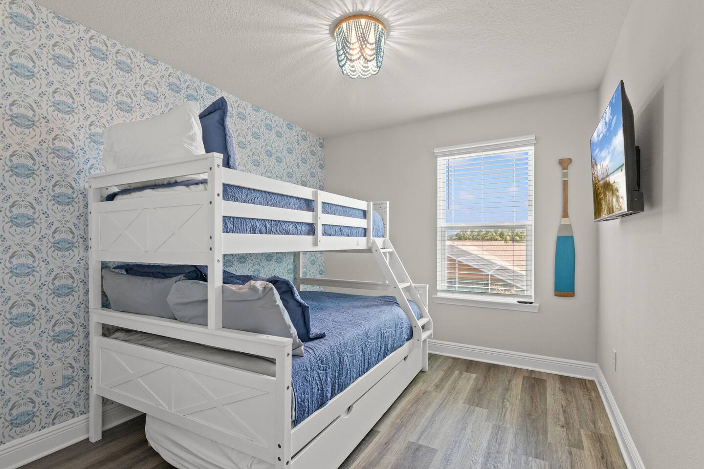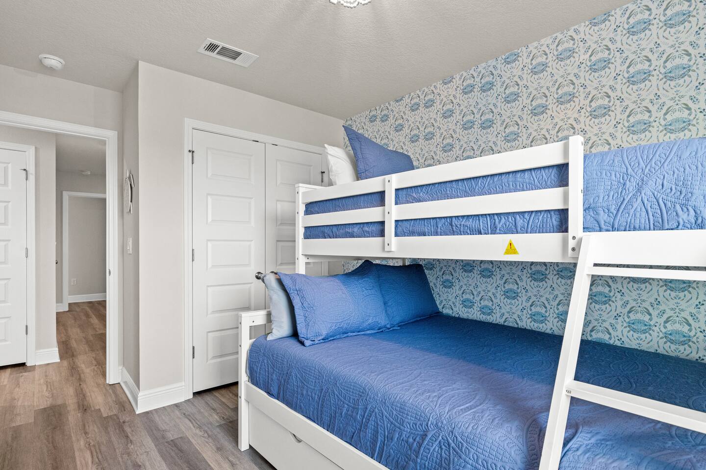 Welcome to Casa del Wave, a chic and stylish 3-bedroom, 2.5-bathroom townhome designed for creating unforgettable memories. With a modern coastal vibe, this bright and airy home is just a short walk from PCB's famous sugar-white sand. The open-concept living space is perfect for gathering after a day at the beach. Relax on the comfortable queen sleeper sofa and stream your favorites on the Smart TV. The fully stocked kitchen, complete with stainless steel appliances and a dedicated coffee bar, has everything you need to prepare delicious meals. Sleeping Arrangements – Sleeps 10 (including infants) Main Bedroom: Unwind in a plush king bed. Features a spacious closet and Smart TV. Bedroom 2: Perfect for kids, this room includes a twin-over-full bunk bed and a twin trundle. Features a Smart TV and a large closet. Bedroom 3: A cozy retreat with a queen bed and a twin trundle. Living Room: Includes a sofa bed for additional guests. LIVING ROOM: Open concept living room with Roku Smart TV, couch with sofa bed, bench + table for a complete cozy room to hangout. KITCHEN: Fully equipped with pots, pans, cooking essentials, a drip coffee maker, toaster, blender + more! Seating for 3 around the kitchen island to bring the whole family together. DINING AREA: Dining table in the open layout with seating for 6. Four dining chairs and a dining bench surround the table for your family to come together for meals. BATHROOMS: Sparkling brand new two full bathrooms upstairs and a half bath downstairs. The main bathroom has a walk-in shower with double sinks; second bathroom with tub/shower combo + half bath on the main level. EXTRA SPACES: Enjoy complimentary use of our beach towels, cart, chairs, tent, and cooler along with two bicycles in the garage. OUTDOOR AREAS: Fire up the gas grill (propane included) on the back patio for an evening barbecue. NEIGHBORHOOD: - New build community of townhomes - Quiet family friendly neighborhood - A short walk to the beach - Quick 5 minute drive to grocery store, gas station, and restaurants Your stay at Casa del Wave promises ultimate comfort, unmatched convenience, and a memorable experience. Book now with KirbyAppeal Vacations and enjoy your Panama City Beach adventure in style!