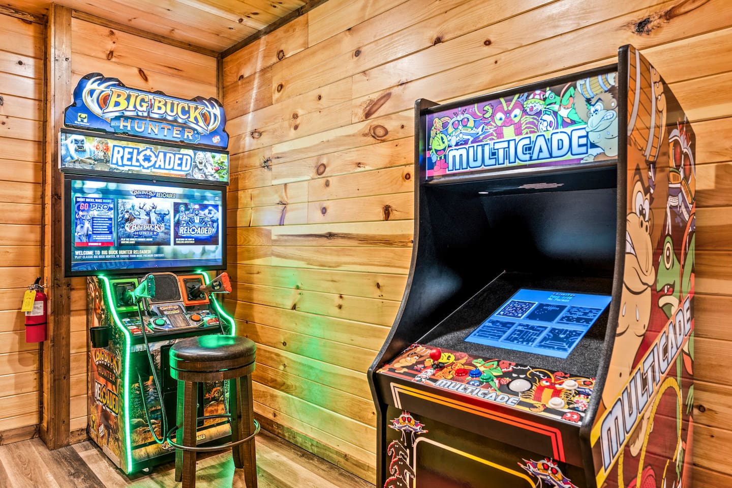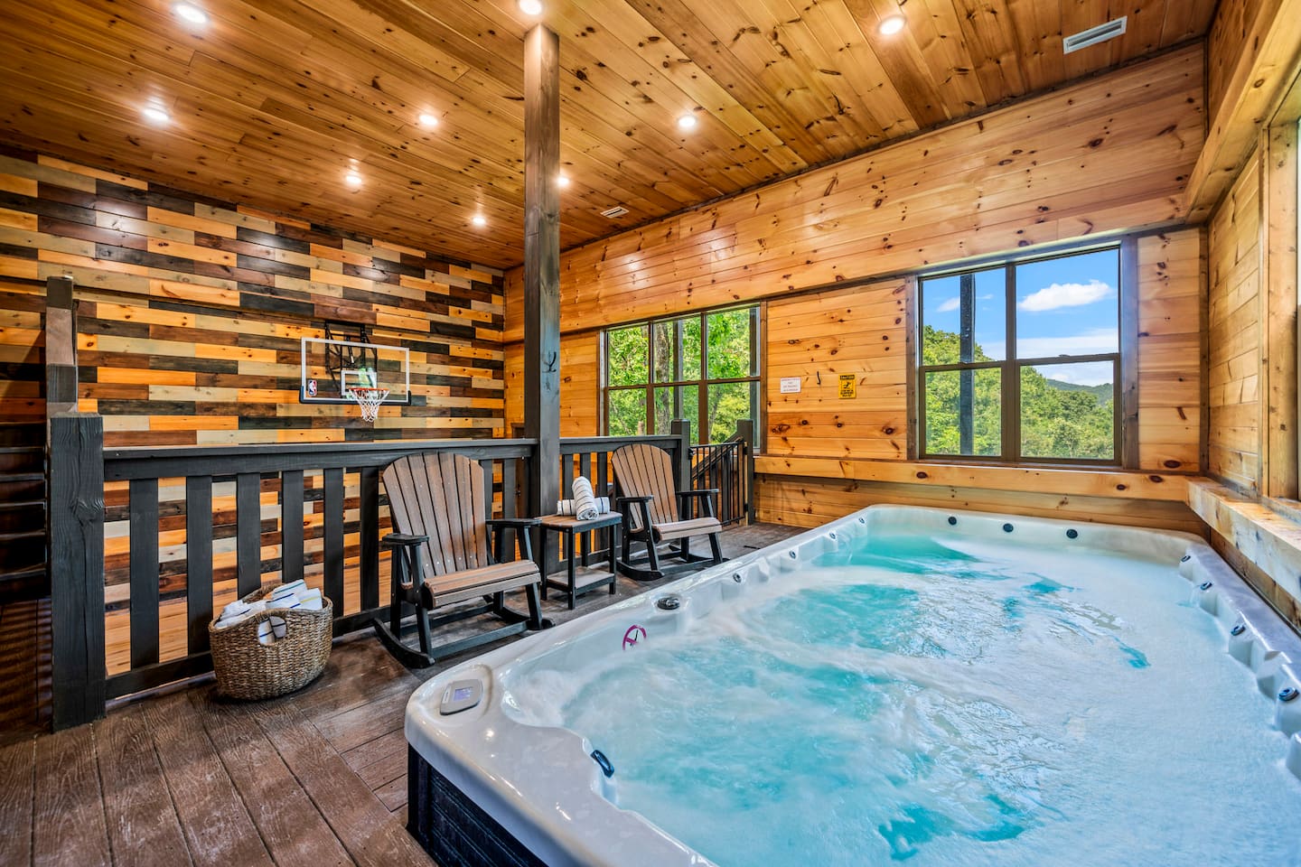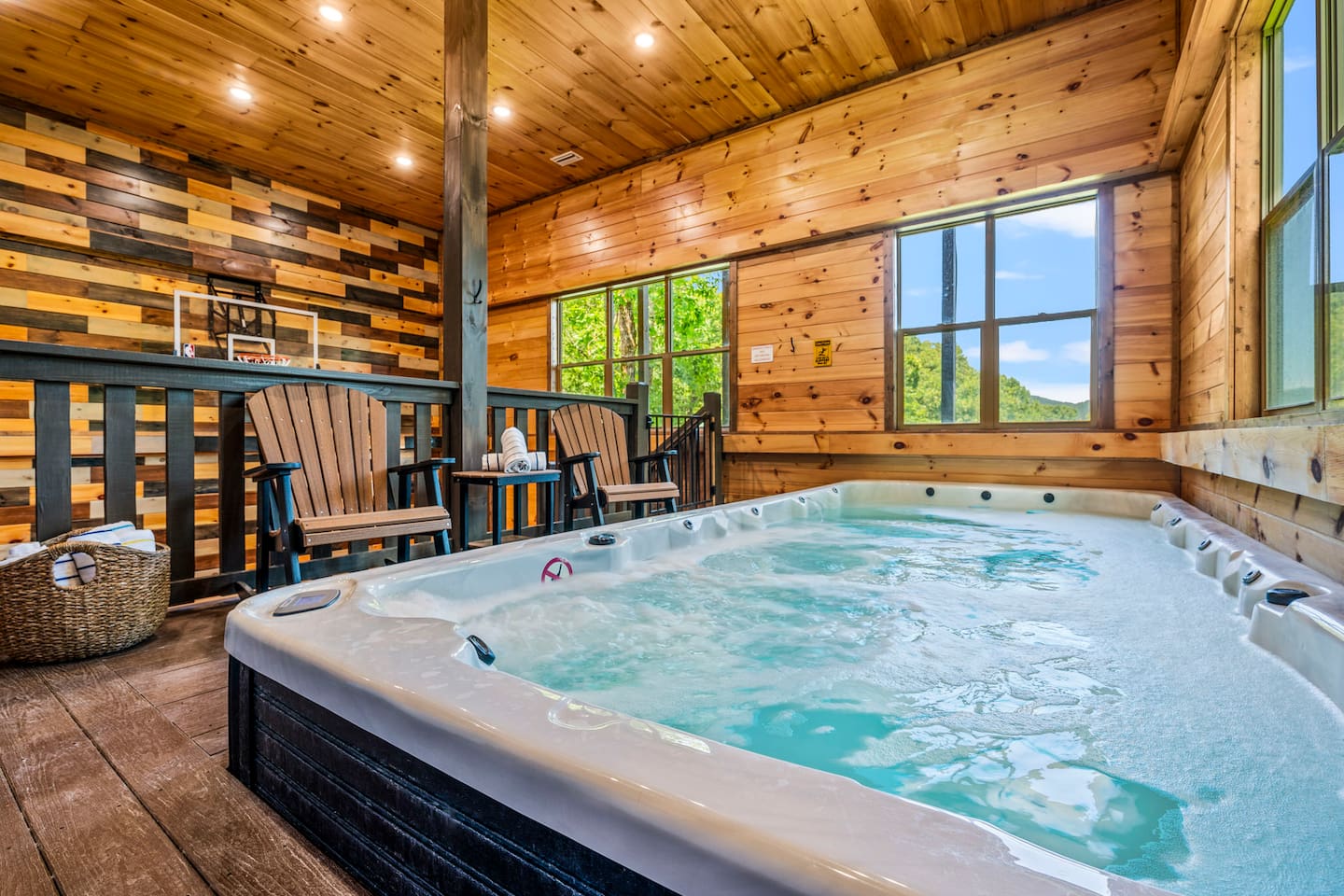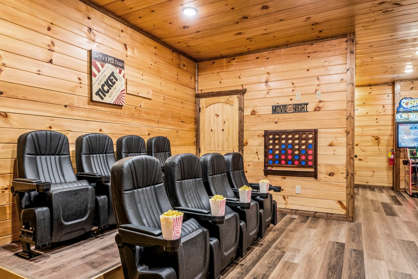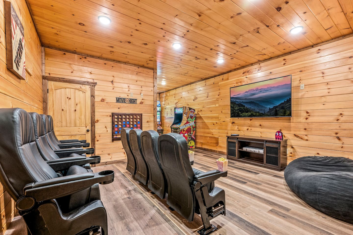 Unwind in the soothing waters of the indoor 16-foot swim spa, relax in the jacuzzi, shoot hoops in the half-court gym, play arcade games, and host epic movie nights in the home theater… for starters. Your premier cabin in Pigeon Forge, Tennessee, is perfect for fun and relaxation on your next family vacation or mountain getaway with friends. Featuring beautiful outdoor spaces with mountain views and wooded surroundings, this charming hideaway in the Great Smoky Mountains is waiting for YOU. Our beautifully appointed 5 bedroom cabin featuring an open loft can accommodate up to 12 guests. With a mix of 3 king beds, 2 queen beds, and 1 queen sleeper, there’s plenty of room for everyone. The 3.5 bathrooms feature shower/tub combos for bubble baths or rejuvenating rinses. Added conveniences include two Pack ’n Plays and a high chair for little ones, a shoe and coat area at the entrance, a fully equipped kitchen with an island, a welcoming dining area, a cozy living room with an electric fireplace, plus a washer/dryer, fast Wi-Fi, and keyless entry. Outdoor Fun Spend quality time with loved ones soaking in the outdoor hot tub, sipping coffee in the rocking chairs, and playing board games together. You’ll have smart TVs in the bedrooms and loft, a big screen TV in the living area, and an even bigger TV in the theater! Extras at this Pigeon Forge cabin rental include wall Connect 4 and tic-tac-toe, a charcoal grill for mountain cookouts, and a flat, paved driveway for easy parking. Kitchen & Dining When you're craving a hearty homemade meal, a quick midnight snack, or classy cocktails with friends, the full kitchen at your cabin has everything you need. Featuring stone counters, a spacious island with bar seating, stainless and black appliances, pots and pans, dishes, glasses, mugs, cutlery, and cooking utensils are all provided for your convenience. A dishwasher makes cleanup a breeze, and a versatile Keurig offers options for both pots and single cups of your favorite hot beverages. The double sink is set beneath a bright window overlooking the trees, and ample natural light streams in from the open-concept dining area. Adjacent to the kitchen is the dining table, where you can enjoy meals together, with additional seating available on the sofas or at the breakfast bar. Between meals, set up a board game, deal cards, work on puzzles, or cover the table for arts and crafts with the kiddos. Swim Spa & Gym A fantastic addition to your Pigeon Forge vacation is the indoor swim spa! This luxurious cabin offers a 16-foot swimming pool with jets, splashy fountains, and underwater seats for a unique experience. You can stretch out and swim like an Olympian with the jets rushing against your shoulders. Plus, this space features a half-court gym with a basketball hoop for even more fun together! Theater & Game Room If you’re looking for family-friendly extras to entertain your group in addition to the indoor swim spa and gym. Look no further than the home theater and game room combo at your luxury cabin in Pigeon Forge. Play Connect 4 and tic-tac-toe on the wall or fire up the Multicade for classic arcade games. There’s also a Big Buck shooting game for 2 players! And when you’re ready for epic movie nights in the Smokies, turn off the lights, get comfy in the theater-style seats or giant bean bag, and press play on the big screen TV. Enjoy a delicious hamburger fresh off the charcoal grill! While the grill is provided, please note that charcoal is not included. You can easily purchase some at a nearby local store. Pet-friendly! 🐾 We welcome up to two pets with a $375 add-on. Please be sure to include your pet in the reservation before arrival so everything is properly noted and prepared for your stay. Note: Before you arrive you will be asked to complete guest verification through third-party provider Happy Guest. This is done to ensure we are keeping up-to-date with short-term rental regulations as well as providing both our guests and our properties with extra protection. Please do so prior to arriving at the property to enable a quick and easy check-in process. Guests must be at least 25 years old to book this cabin. Guests under 25 with stellar reviews may be considered, but a security deposit will be required to reserve the cabin.