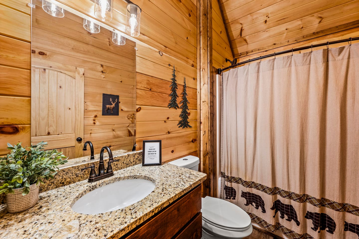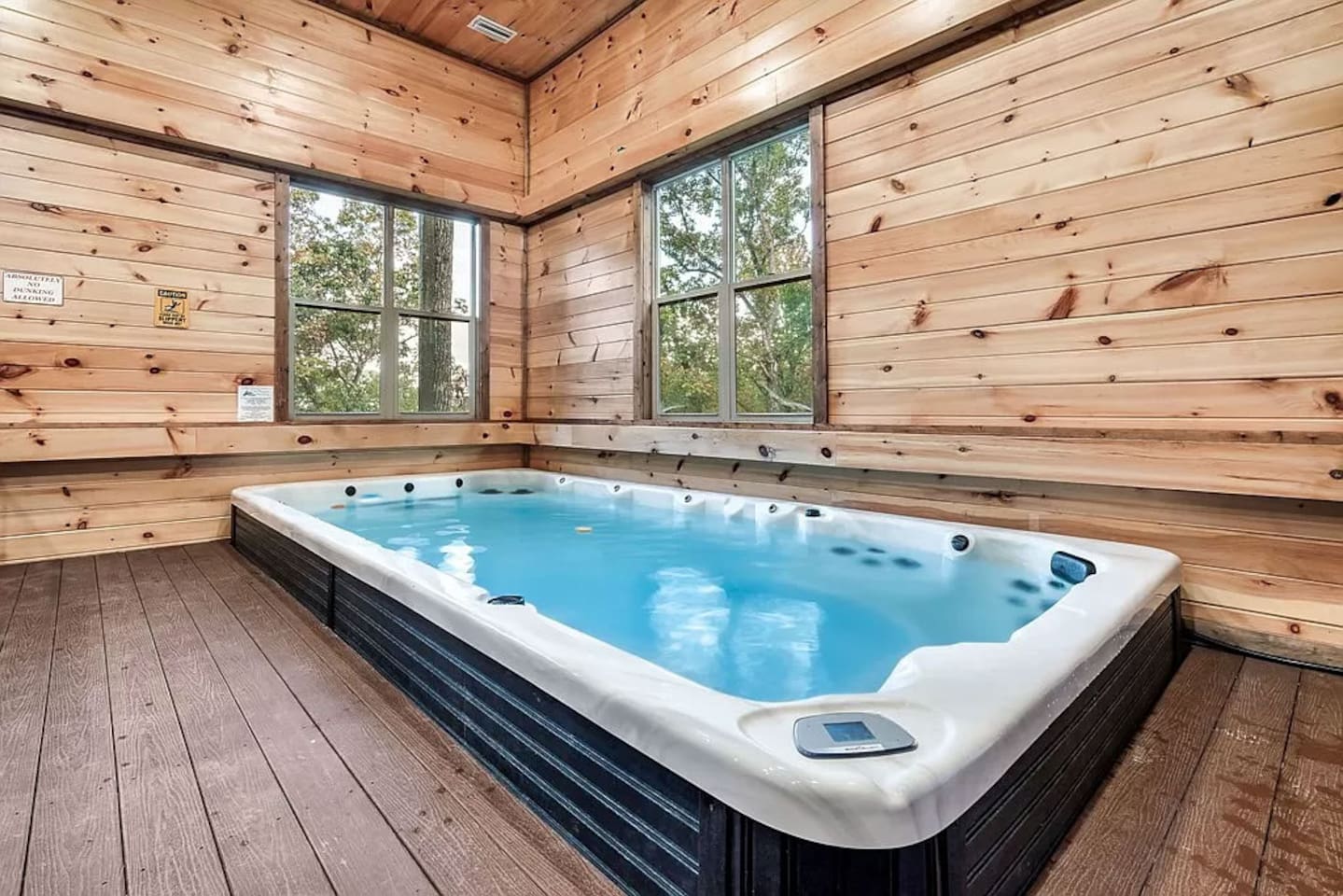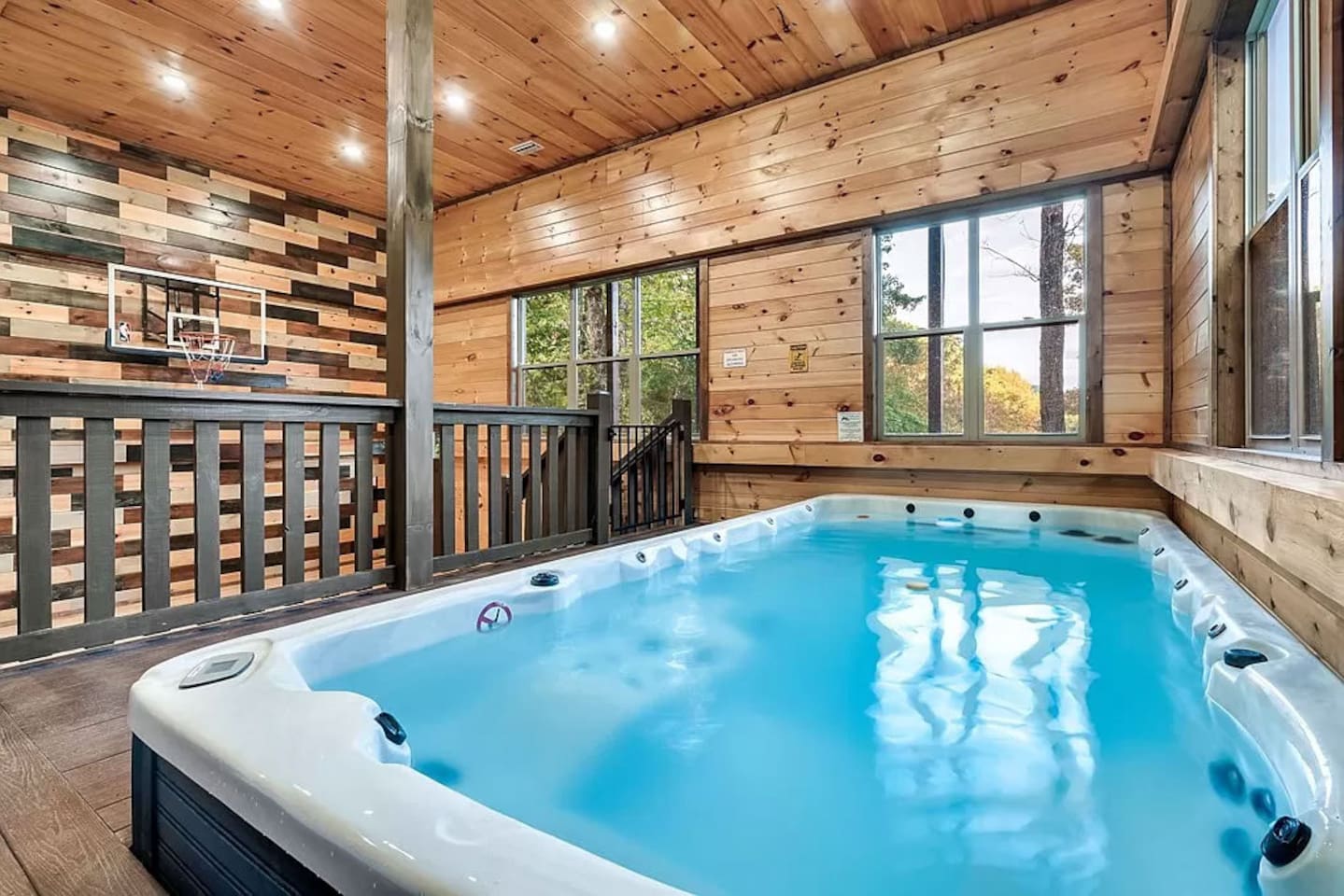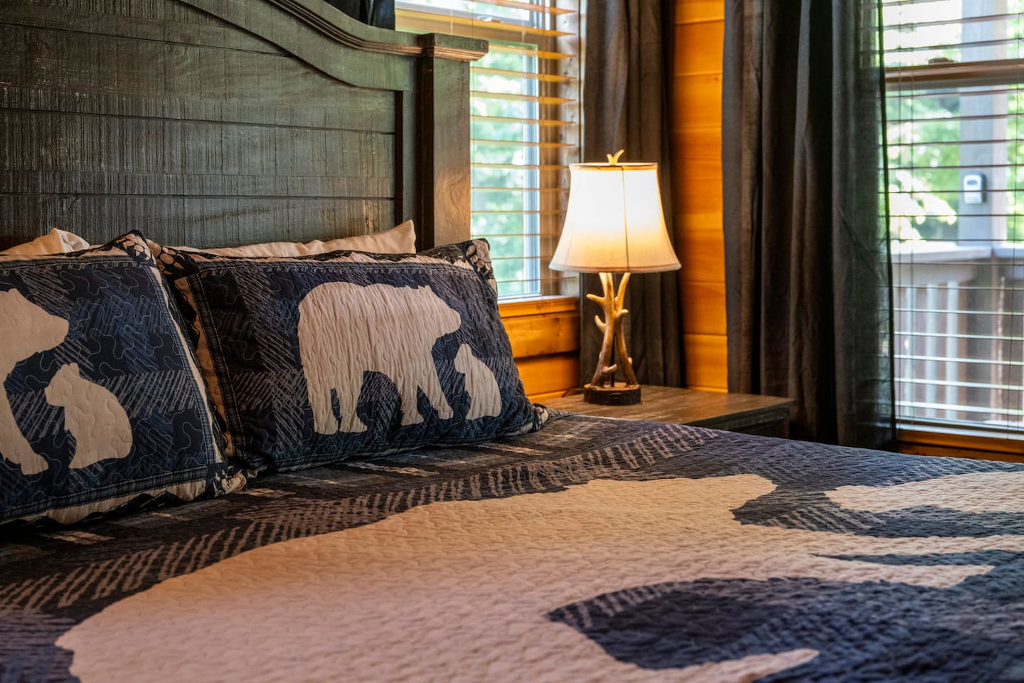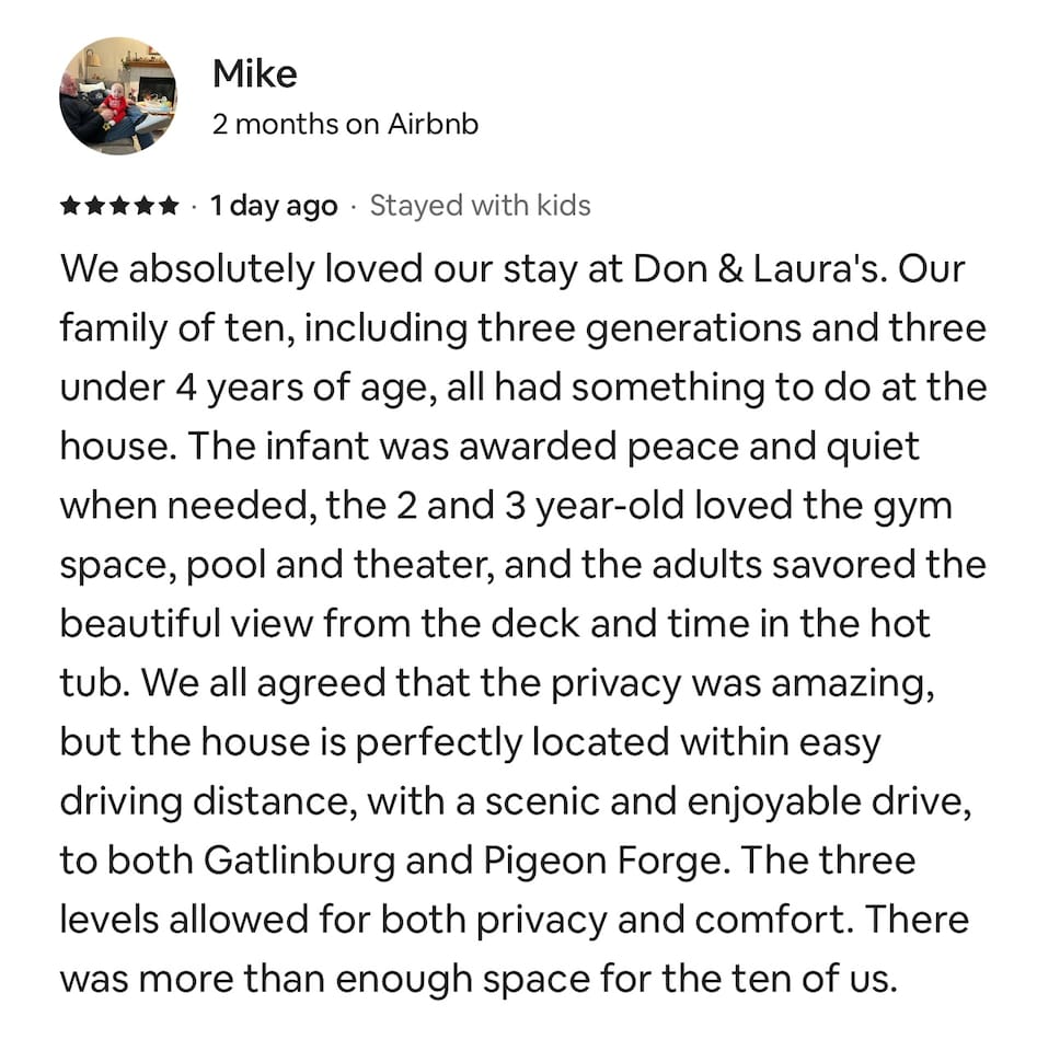 Unwind in the soothing waters of the indoor 16-foot swim spa, relax in the jacuzzi, shoot hoops in the half-court gym, play arcade games, and host epic movie nights in the home theater… for starters. Your premier cabin in Pigeon Forge, Tennessee, is perfect for fun and relaxation on your next family vacation or mountain getaway with friends. Featuring beautiful outdoor spaces with mountain views and wooded surroundings, this charming hideaway in the Great Smoky Mountains is waiting for YOU. Our beautifully appointed 5 bedroom cabin featuring an open loft can accommodate up to 12 guests. With a mix of 3 king beds, 2 queen beds, and 1 queen sleeper, there’s plenty of room for everyone. The 3.5 bathrooms feature shower/tub combos for bubble baths or rejuvenating rinses. Added conveniences include two Pack ’n Plays and a high chair for little ones, a shoe and coat area at the entrance, a fully equipped kitchen with an island, a welcoming dining area, a cozy living room with an electric fireplace, plus a washer/dryer, fast Wi-Fi, and keyless entry. Outdoor Fun Spend quality time with loved ones soaking in the outdoor hot tub, sipping coffee in the rocking chairs, and playing board games together. You’ll have smart TVs in the bedrooms and loft, a big screen TV in the living area, and an even bigger TV in the theater! Extras at this Pigeon Forge cabin rental include wall Connect 4 and tic-tac-toe, a charcoal grill for mountain cookouts, and a flat, paved driveway for easy parking. Kitchen & Dining When you're craving a hearty homemade meal, a quick midnight snack, or classy cocktails with friends, the full kitchen at your cabin has everything you need. Featuring stone counters, a spacious island with bar seating, stainless and black appliances, pots and pans, dishes, glasses, mugs, cutlery, and cooking utensils are all provided for your convenience. A dishwasher makes cleanup a breeze, and a versatile Keurig offers options for both pots and single cups of your favorite hot beverages. The double sink is set beneath a bright window overlooking the trees, and ample natural light streams in from the open-concept dining area. Adjacent to the kitchen is the dining table, where you can enjoy meals together, with additional seating available on the sofas or at the breakfast bar. Between meals, set up a board game, deal cards, work on puzzles, or cover the table for arts and crafts with the kiddos. Swim Spa & Gym A fantastic addition to your Pigeon Forge vacation is the indoor swim spa! This luxurious cabin offers a 16-foot swimming pool with jets, splashy fountains, and underwater seats for a unique experience. You can stretch out and swim like an Olympian with the jets rushing against your shoulders. Plus, this space features a half-court gym with a basketball hoop for even more fun together! Theater & Game Room If you’re looking for family-friendly extras to entertain your group in addition to the indoor swim spa and gym. Look no further than the home theater and game room combo at your luxury cabin in Pigeon Forge. Play Connect 4 and tic-tac-toe on the wall or fire up the Multicade for classic arcade games. There’s also a Big Buck shooting game for 2 players! And when you’re ready for epic movie nights in the Smokies, turn off the lights, get comfy in the theater-style seats or giant bean bag, and press play on the big screen TV. Enjoy a delicious hamburger fresh off the charcoal grill! While the grill is provided, please note that charcoal is not included. You can easily purchase some at a nearby local store. Pet-friendly! 🐾 We welcome up to two pets with a $375 add-on. Please be sure to include your pet in the reservation before arrival so everything is properly noted and prepared for your stay. Note: Before you arrive you will be asked to complete guest verification through third-party provider Happy Guest. This is done to ensure we are keeping up-to-date with short-term rental regulations as well as providing both our guests and our properties with extra protection. Please do so prior to arriving at the property to enable a quick and easy check-in process. Guests must be at least 25 years old to book this cabin. Guests under 25 with stellar reviews may be considered, but a security deposit will be required to reserve the cabin.