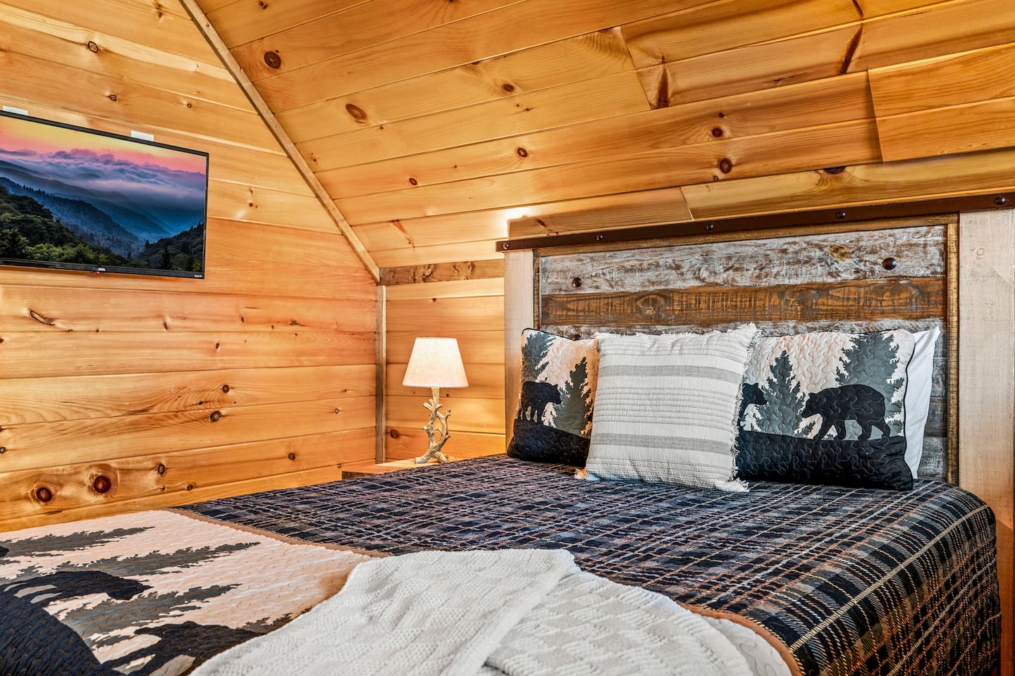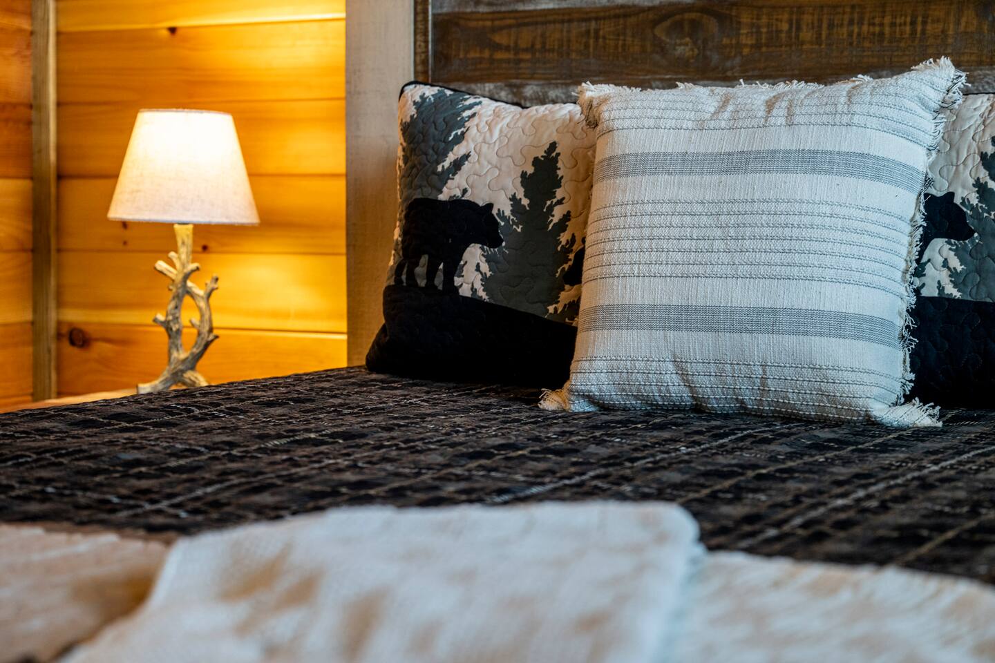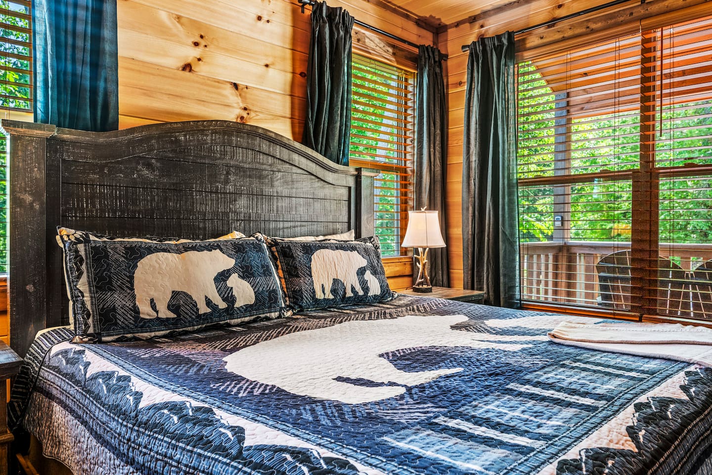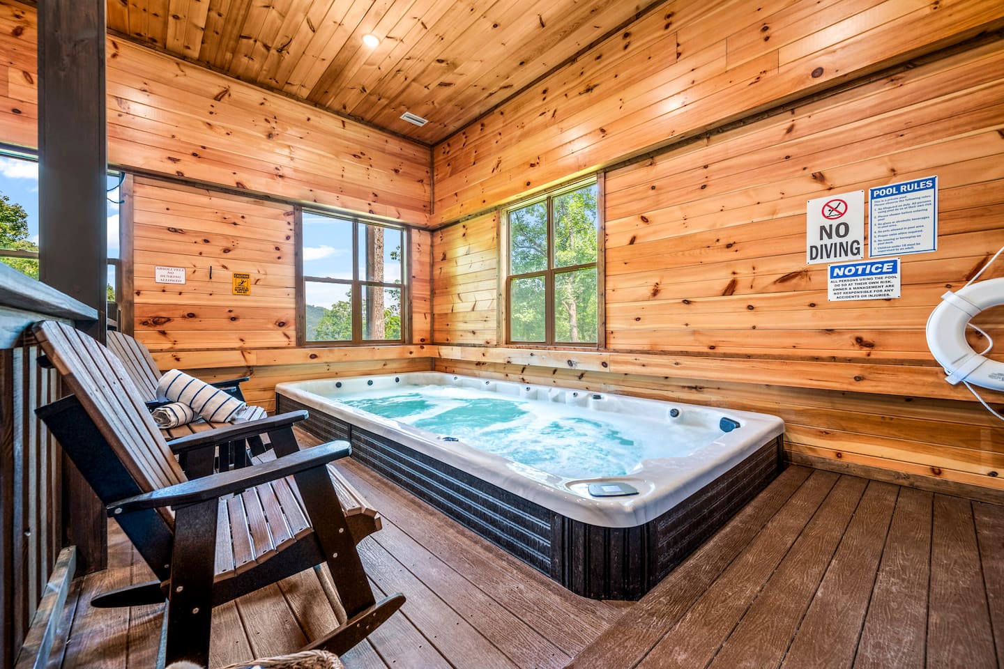 Unwind in the soothing waters of the indoor 16-foot swim spa, relax in the jacuzzi, shoot hoops in the half-court gym, play arcade games, and host epic movie nights in the home theater… for starters. Your premier cabin in Pigeon Forge, Tennessee, is perfect for fun and relaxation on your next family vacation or mountain getaway with friends. Featuring beautiful outdoor spaces with mountain views and wooded surroundings, this charming hideaway in the Great Smoky Mountains is waiting for YOU. Our beautifully appointed 5 bedroom cabin featuring an open loft can accommodate up to 12 guests. With a mix of 3 king beds, 2 queen beds, and 1 queen sleeper, there’s plenty of room for everyone. The 3.5 bathrooms feature shower/tub combos for bubble baths or rejuvenating rinses. Added conveniences include two Pack ’n Plays and a high chair for little ones, a shoe and coat area at the entrance, a fully equipped kitchen with an island, a welcoming dining area, a cozy living room with an electric fireplace, plus a washer/dryer, fast Wi-Fi, and keyless entry. Outdoor Fun Spend quality time with loved ones soaking in the outdoor hot tub, sipping coffee in the rocking chairs, and playing board games together. You’ll have smart TVs in the bedrooms and loft, a big screen TV in the living area, and an even bigger TV in the theater! Extras at this Pigeon Forge cabin rental include wall Connect 4 and tic-tac-toe, a charcoal grill for mountain cookouts, and a flat, paved driveway for easy parking. Kitchen & Dining When you're craving a hearty homemade meal, a quick midnight snack, or classy cocktails with friends, the full kitchen at your cabin has everything you need. Featuring stone counters, a spacious island with bar seating, stainless and black appliances, pots and pans, dishes, glasses, mugs, cutlery, and cooking utensils are all provided for your convenience. A dishwasher makes cleanup a breeze, and a versatile Keurig offers options for both pots and single cups of your favorite hot beverages. The double sink is set beneath a bright window overlooking the trees, and ample natural light streams in from the open-concept dining area. Adjacent to the kitchen is the dining table, where you can enjoy meals together, with additional seating available on the sofas or at the breakfast bar. Between meals, set up a board game, deal cards, work on puzzles, or cover the table for arts and crafts with the kiddos. Swim Spa & Gym A fantastic addition to your Pigeon Forge vacation is the indoor swim spa! This luxurious cabin offers a 16-foot swimming pool with jets, splashy fountains, and underwater seats for a unique experience. You can stretch out and swim like an Olympian with the jets rushing against your shoulders. Plus, this space features a half-court gym with a basketball hoop for even more fun together! Theater & Game Room If you’re looking for family-friendly extras to entertain your group in addition to the indoor swim spa and gym. Look no further than the home theater and game room combo at your luxury cabin in Pigeon Forge. Play Connect 4 and tic-tac-toe on the wall or fire up the Multicade for classic arcade games. There’s also a Big Buck shooting game for 2 players! And when you’re ready for epic movie nights in the Smokies, turn off the lights, get comfy in the theater-style seats or giant bean bag, and press play on the big screen TV. Enjoy a delicious hamburger fresh off the charcoal grill! While the grill is provided, please note that charcoal is not included. You can easily purchase some at a nearby local store. Pet-friendly! 🐾 We welcome up to two pets with a $375 add-on. Please be sure to include your pet in the reservation before arrival so everything is properly noted and prepared for your stay. Note: Before you arrive you will be asked to complete guest verification through third-party provider Happy Guest. This is done to ensure we are keeping up-to-date with short-term rental regulations as well as providing both our guests and our properties with extra protection. Please do so prior to arriving at the property to enable a quick and easy check-in process. Guests must be at least 25 years old to book this cabin. Guests under 25 with stellar reviews may be considered, but a security deposit will be required to reserve the cabin.