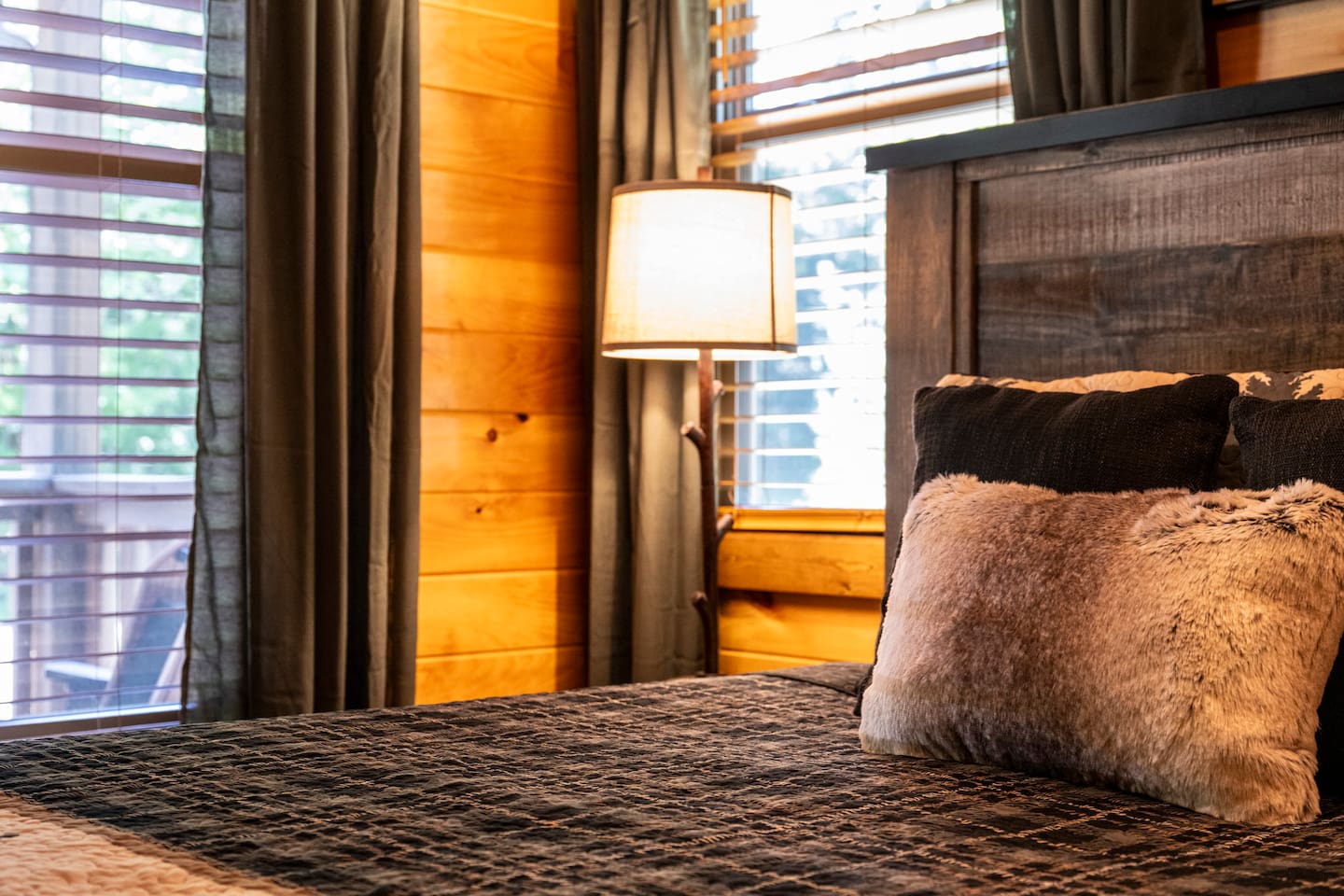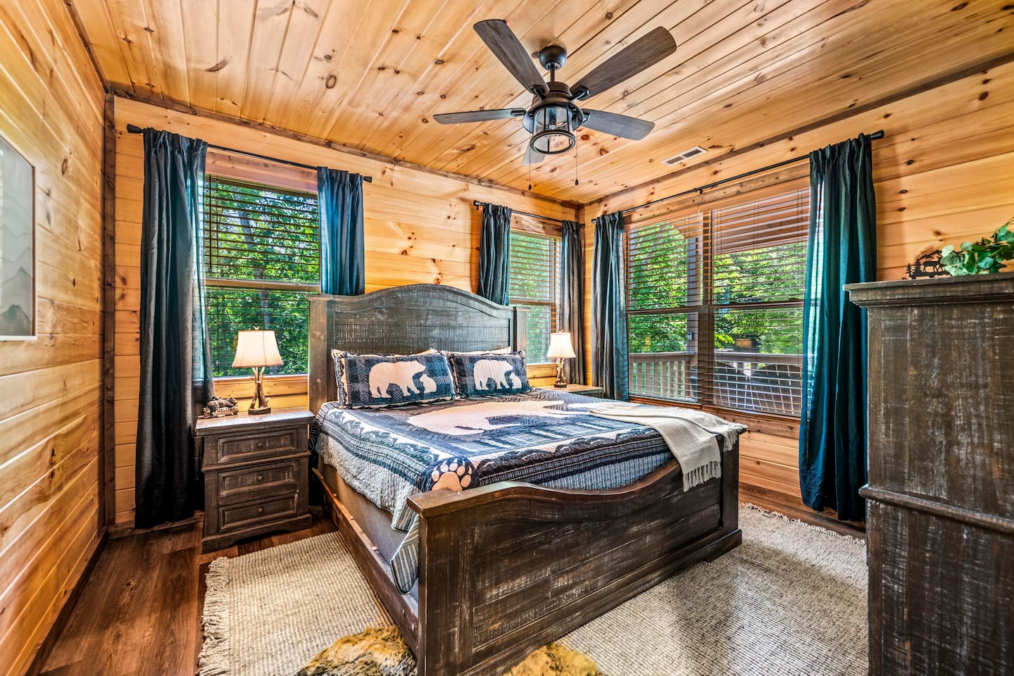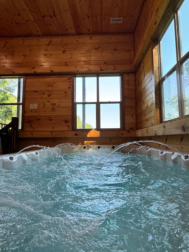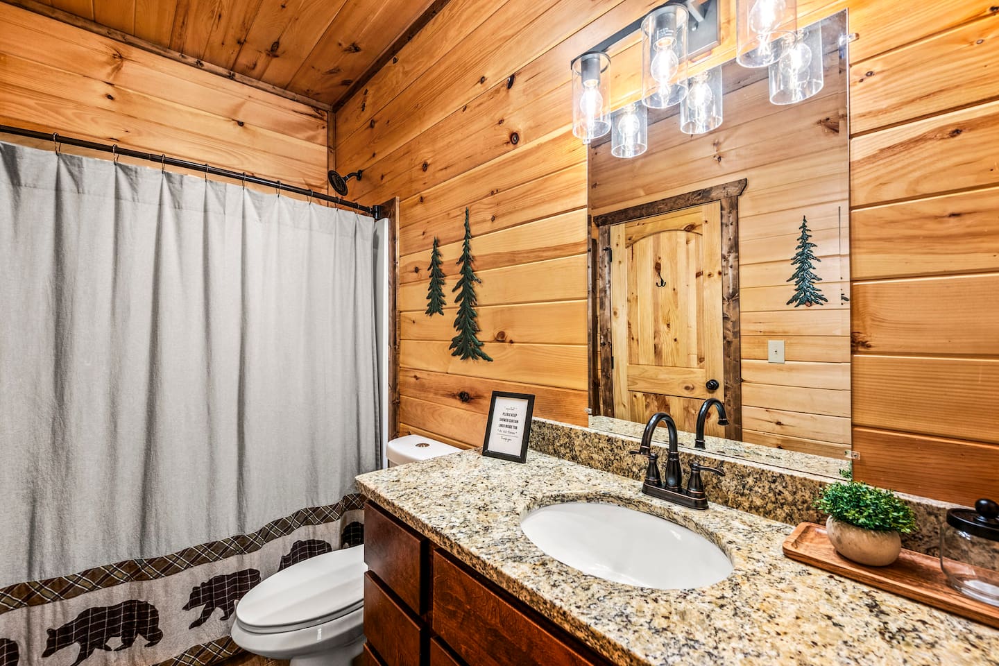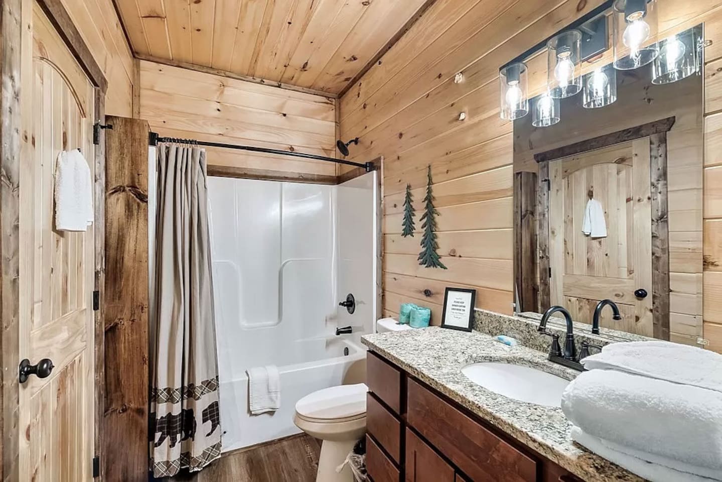 Unwind in the soothing waters of the indoor 16-foot swim spa, relax in the jacuzzi, shoot hoops in the half-court gym, play arcade games, and host epic movie nights in the home theater… for starters. Your premier cabin in Pigeon Forge, Tennessee, is perfect for fun and relaxation on your next family vacation or mountain getaway with friends. Featuring beautiful outdoor spaces with mountain views and wooded surroundings, this charming hideaway in the Great Smoky Mountains is waiting for YOU. Our beautifully appointed 5 bedroom cabin featuring an open loft can accommodate up to 12 guests. With a mix of 3 king beds, 2 queen beds, and 1 queen sleeper, there’s plenty of room for everyone. The 3.5 bathrooms feature shower/tub combos for bubble baths or rejuvenating rinses. Added conveniences include two Pack ’n Plays and a high chair for little ones, a shoe and coat area at the entrance, a fully equipped kitchen with an island, a welcoming dining area, a cozy living room with an electric fireplace, plus a washer/dryer, fast Wi-Fi, and keyless entry. Outdoor Fun Spend quality time with loved ones soaking in the outdoor hot tub, sipping coffee in the rocking chairs, and playing board games together. You’ll have smart TVs in the bedrooms and loft, a big screen TV in the living area, and an even bigger TV in the theater! Extras at this Pigeon Forge cabin rental include wall Connect 4 and tic-tac-toe, a charcoal grill for mountain cookouts, and a flat, paved driveway for easy parking. Kitchen & Dining When you're craving a hearty homemade meal, a quick midnight snack, or classy cocktails with friends, the full kitchen at your cabin has everything you need. Featuring stone counters, a spacious island with bar seating, stainless and black appliances, pots and pans, dishes, glasses, mugs, cutlery, and cooking utensils are all provided for your convenience. A dishwasher makes cleanup a breeze, and a versatile Keurig offers options for both pots and single cups of your favorite hot beverages. The double sink is set beneath a bright window overlooking the trees, and ample natural light streams in from the open-concept dining area. Adjacent to the kitchen is the dining table, where you can enjoy meals together, with additional seating available on the sofas or at the breakfast bar. Between meals, set up a board game, deal cards, work on puzzles, or cover the table for arts and crafts with the kiddos. Swim Spa & Gym A fantastic addition to your Pigeon Forge vacation is the indoor swim spa! This luxurious cabin offers a 16-foot swimming pool with jets, splashy fountains, and underwater seats for a unique experience. You can stretch out and swim like an Olympian with the jets rushing against your shoulders. Plus, this space features a half-court gym with a basketball hoop for even more fun together! Theater & Game Room If you’re looking for family-friendly extras to entertain your group in addition to the indoor swim spa and gym. Look no further than the home theater and game room combo at your luxury cabin in Pigeon Forge. Play Connect 4 and tic-tac-toe on the wall or fire up the Multicade for classic arcade games. There’s also a Big Buck shooting game for 2 players! And when you’re ready for epic movie nights in the Smokies, turn off the lights, get comfy in the theater-style seats or giant bean bag, and press play on the big screen TV. Enjoy a delicious hamburger fresh off the charcoal grill! While the grill is provided, please note that charcoal is not included. You can easily purchase some at a nearby local store. Pet-friendly! 🐾 We welcome up to two pets with a $375 add-on. Please be sure to include your pet in the reservation before arrival so everything is properly noted and prepared for your stay. Note: Before you arrive you will be asked to complete guest verification through third-party provider Happy Guest. This is done to ensure we are keeping up-to-date with short-term rental regulations as well as providing both our guests and our properties with extra protection. Please do so prior to arriving at the property to enable a quick and easy check-in process. Guests must be at least 25 years old to book this cabin. Guests under 25 with stellar reviews may be considered, but a security deposit will be required to reserve the cabin.